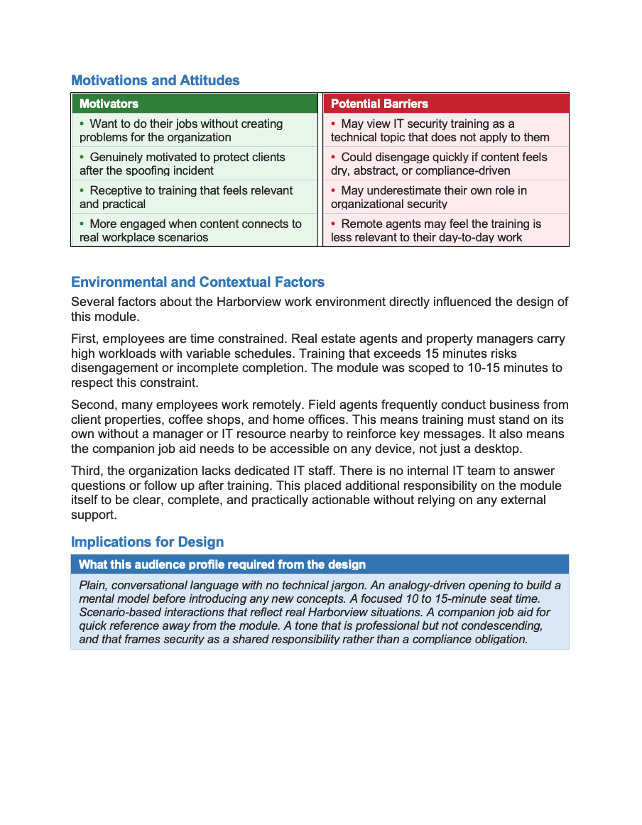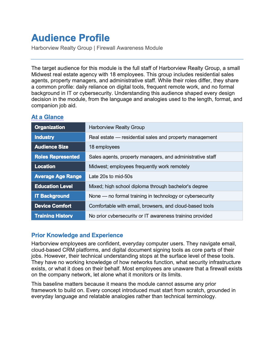 I built the audience profile from two sources. A stakeholder interview with Dana Kellerman identified the learners: 18 employees across sales, property management, and administrative roles, comfortable with everyday digital tools but completely unfamiliar with IT concepts. Dana also confirmed that no formal technology or security training had ever been provided. This was a first-exposure audience, not a refresher audience, and that distinction shaped every decision that followed.