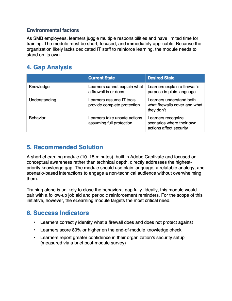 I connected each finding directly to a design choice. The knowledge gap led me to open the module with an analogy that builds a mental model before I introduced any technical content. The misconception finding made what a firewall cannot do, a non-negotiable inclusion rather than an afterthought. The behavioral risk pattern shaped the scenario-based knowledge check, where learners respond to situations that mirror the decisions they face in their actual work. The audience profile drove my choice of a 10-15-minute seat time, plain conversational language, and a companion job aid for employees working away from the office.