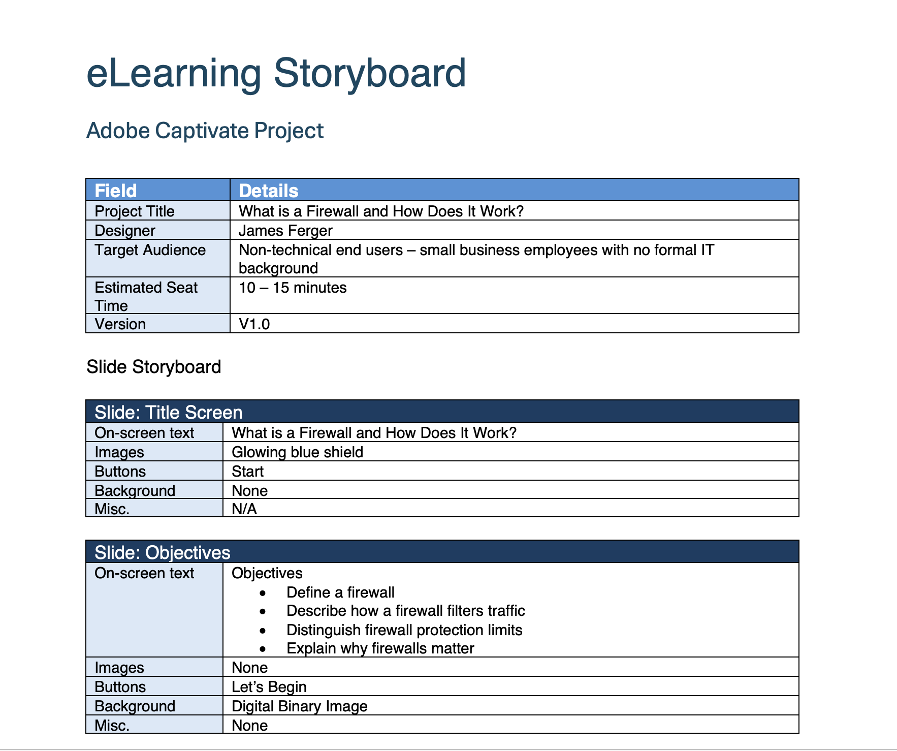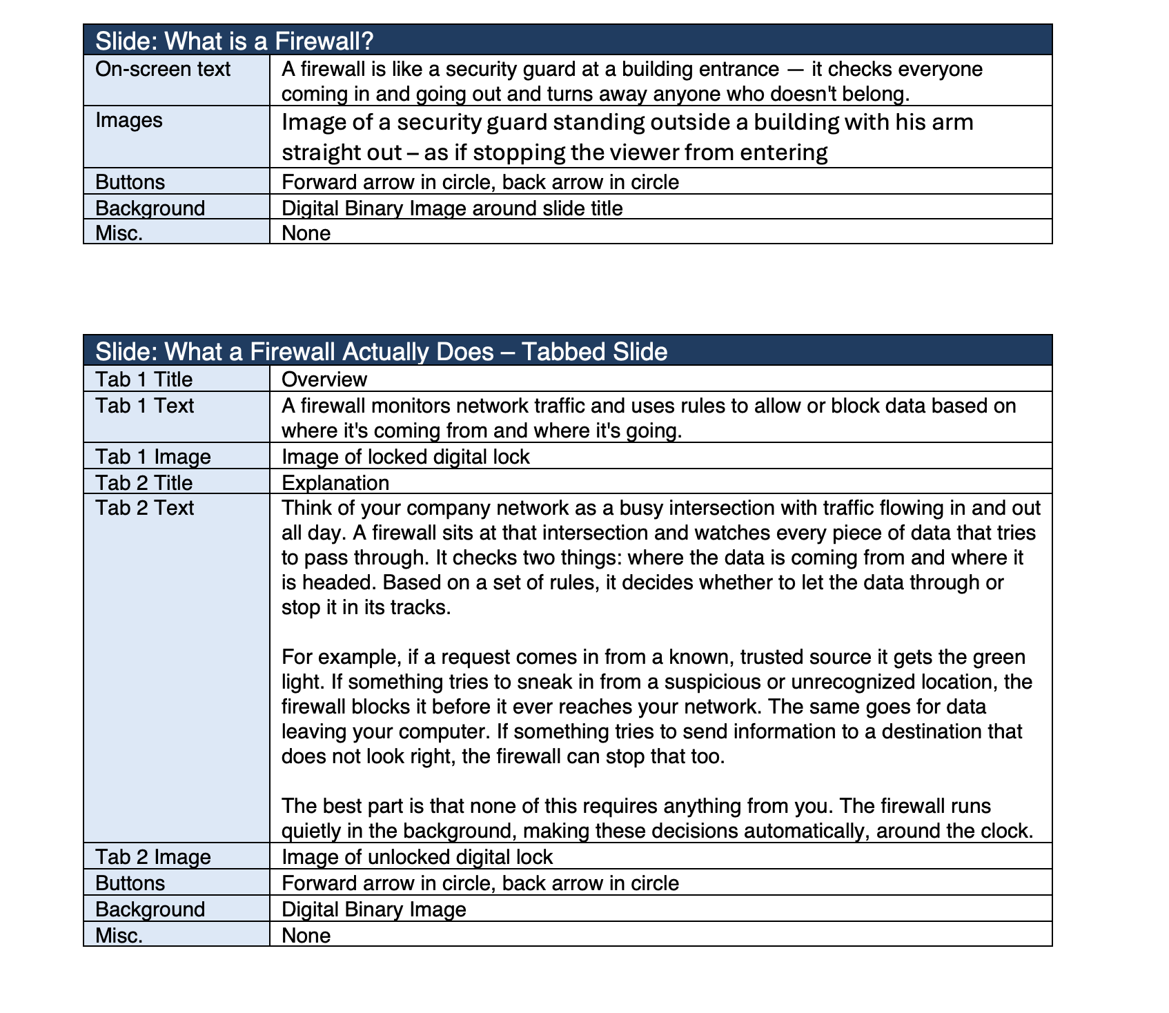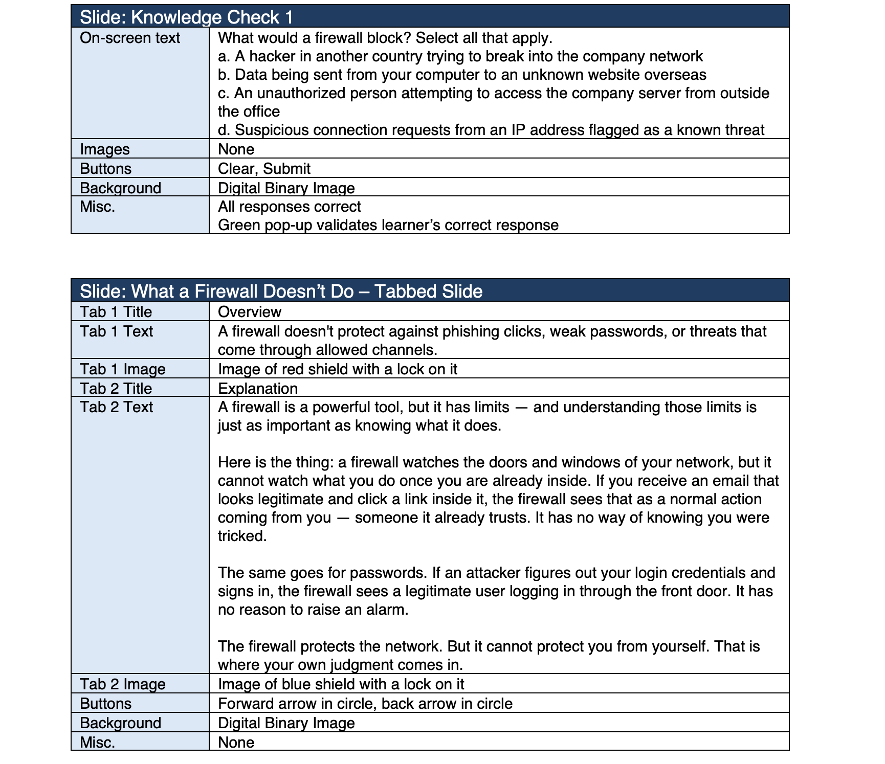 A scenario-based eLearning module designed to help non-technical small business employees understand what a firewall does, what it cannot do, and why their daily decisions matter for organizational security.