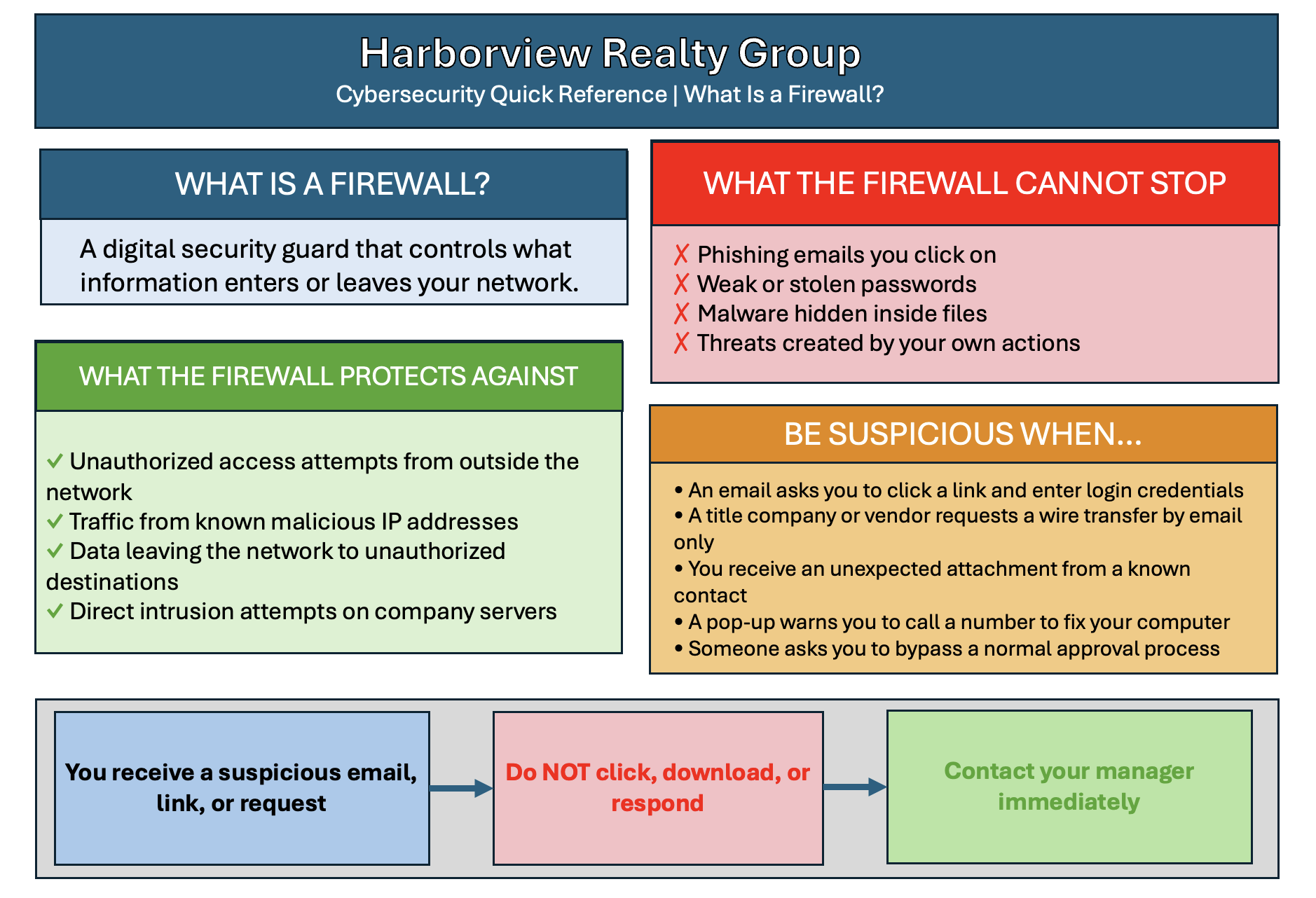 The incident prompted Harborview's office manager, Dana Kellerman, to work with an outside IT consultant to assess the company's security posture. The consultant confirmed that Harborview had a functioning firewall on its office network but identified a significant gap: employees did not understand what the firewall protected, what it did not cover, and how their own actions created risk. The consultant recommended a short security awareness training as a first step.